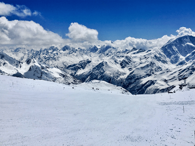 На третий день я запланировал сделать пробную вылазку уже на сам Эльбрус, подняться до 4000 метров и договориться там, в одном из приютов о проживании у них на период восхождения. Собравшись с утра, я решил начать свой подъем пешком, для лучшей акклиматизации и в целом понять, что там меня ожидает, ведь тут подъем начинался уже сразу по снегу. Дойдя до самой горы, в самом начале попадаешь на площадку с развитой инфраструктурой, тут есть и прокат, и магазинчики, и банкомат, и кафешки, и вход на канатную дорогу. Я прошел через площадь и свернул вправо, огибая «канатку» и попадая на открытую часть горы, доступную для пешего подъема, что-ж началось, и пройдя совсем небольшое расстояние я окапываюсь чтобы отдышаться, а мимо пробегают спортсмены, как будто и не замечая вязкого снега и подъема в целом, глядя вниз открывается маленький пятачок площадки, да и вообще красивый вид.