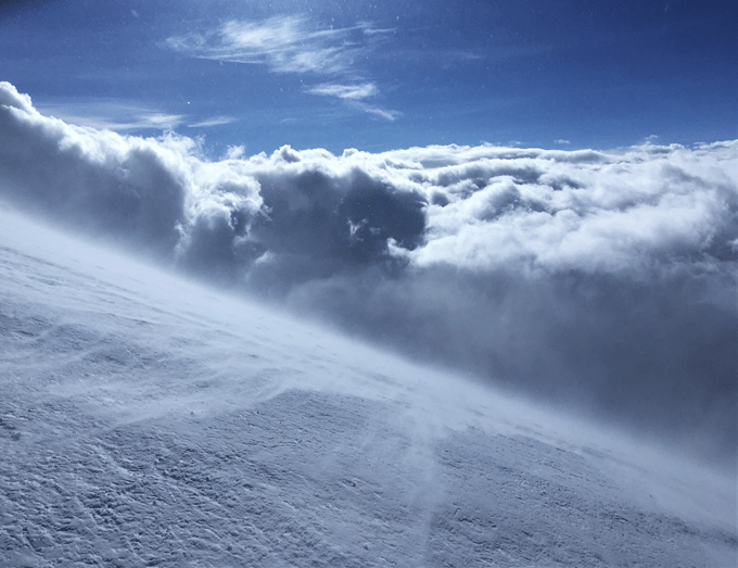 «Нет ребята, мне и с вами не по пути» пронеслось у меня в этот момент, после чего мы попрощались, и я продолжил движение один. Погодка не радовала, видимость была на одну впереди стоящую «вешку» снег метет, но не сильно и вдруг, перед поворотом на «косую полку» (об этом я узнаю чуть позже) справа от меня открылся удивительный вид! Солнце, метущий снег и облака под ногами, вот это даа!