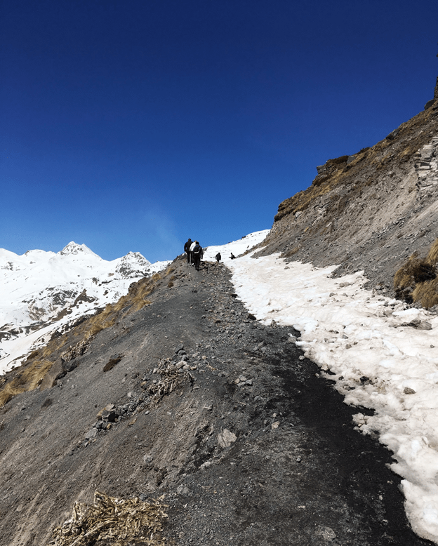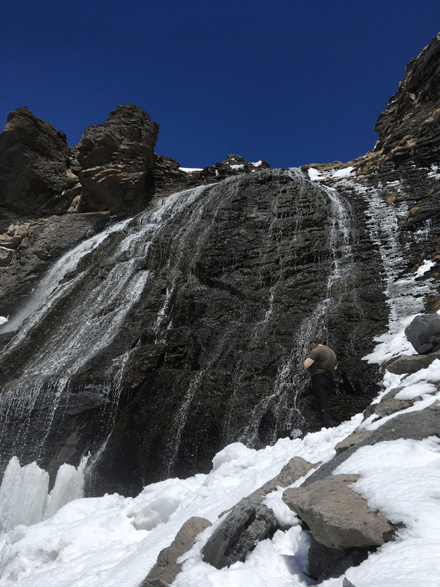 Далее, с набором высоты лесистая часть закончилась и на тропе все чаще стал появляться снег, идя по тропе я увидел медленно продвигающуюся группу и решил обогнать ее чтобы поскорее добраться до места своего назначения, мне хотелось поскорее увидеть этот водопад, отчего я настолько ускорился, что еще немного, и можно сказать, что я бежал.