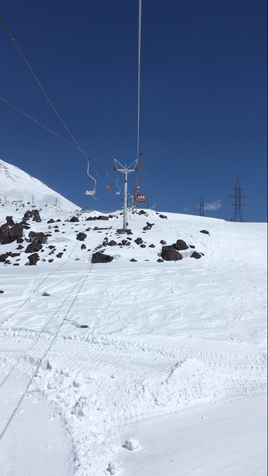 Передохнув и продвигаясь дальше, я увидел одну из старых «канаток», открытых двухместных, если будете на Эльбрусе обязательно посетите, для меня поездка на ней принесла необычайную радость. Раньше я на «канатках» вообще не передвигался, а тут такое, старинная, да еще и открытая, едешь, тебя подбрасывает и трясет, в лицо дует ветер, а прямо под тобой проносятся лыжники и сноубордисты.